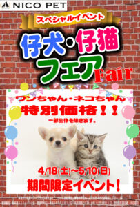 4月18日(土)~5月10日(日)は仔犬・仔猫フェアを開催いたします。